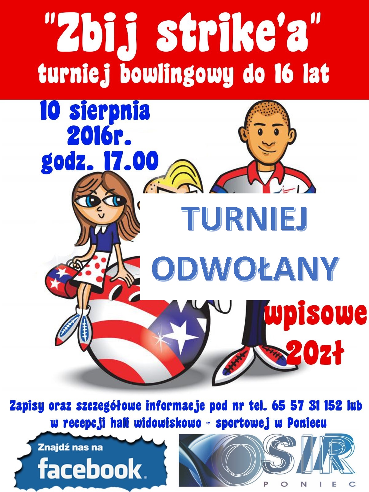 Uprzejmie informujemy, iż turniej bowlingowy do lat 16 "Zbij Strike'a" , który miał sie odbyć jutro tj. 10.08.2016 o godz. 17.00 został odwołany z powodu niskiej frekwencji. Przepraszamy